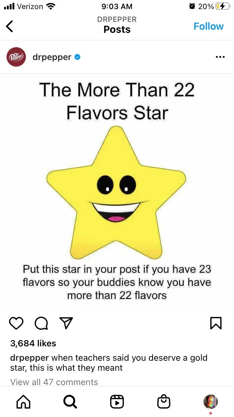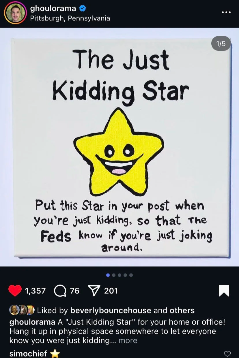 THE JUST KIDDING STAR (2019) is a meta-humor posting element I created to make jokes more legible and playfully signpost the irony inherent to the medium. It’s structural simplicity invited iteration and the star quickly mutated across other meme pages and developed into a “star posting” microtrend - even picked up by big brands like Dr. Pepper*